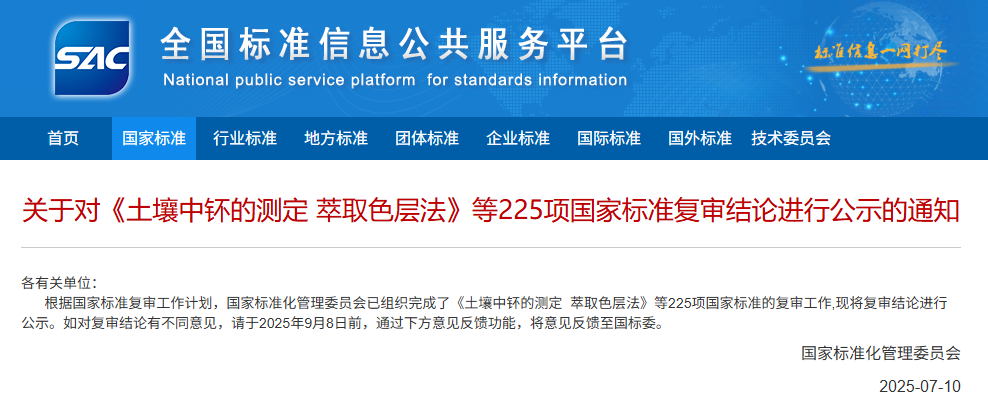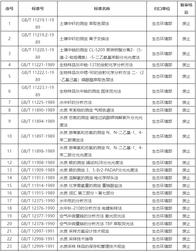 國家標準化管理委員會近日發(fā)布通知,對《土壤中钚的測定 萃取色層法》等225項國家標準的復審結論進行公示。根據(jù)公示內(nèi)容,其中由生態(tài)環(huán)境部歸口管理的84項國家標準被建議廢止,且廢止過渡期為公告即廢止