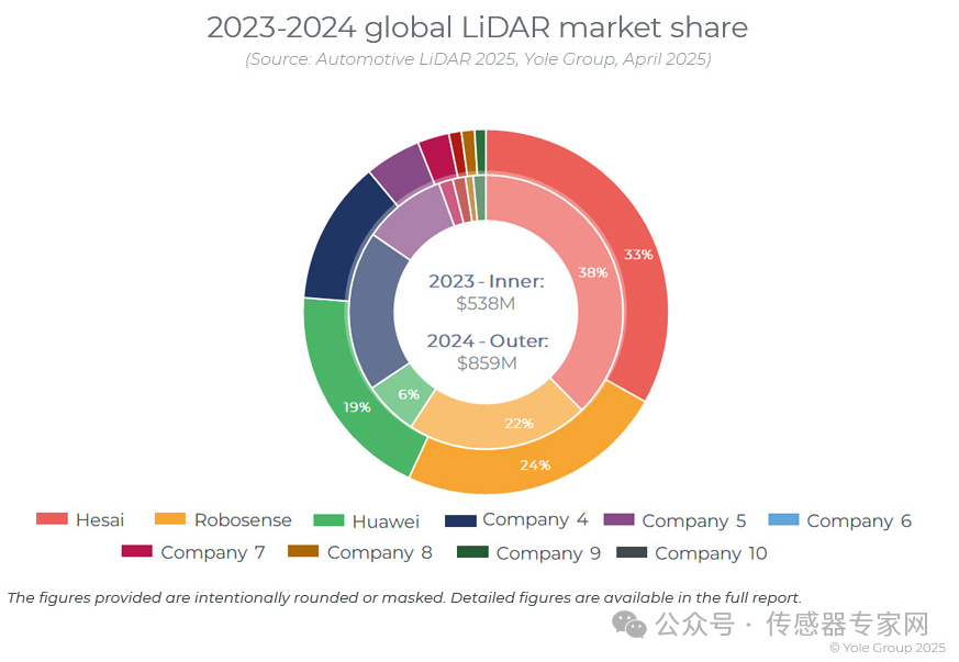 據今年4月份,咨詢機構Yole Group發布最新全球激光雷達產業報告《Automotive LiDAR 2025 》(2025車載激光雷達報告)數據顯示,中國激光雷達廠商禾賽科技占據33%的市場份額,其次是速騰聚創(24%)、華為(19%)和圖達通。這四家中國廠商占據了88%的市場份額。