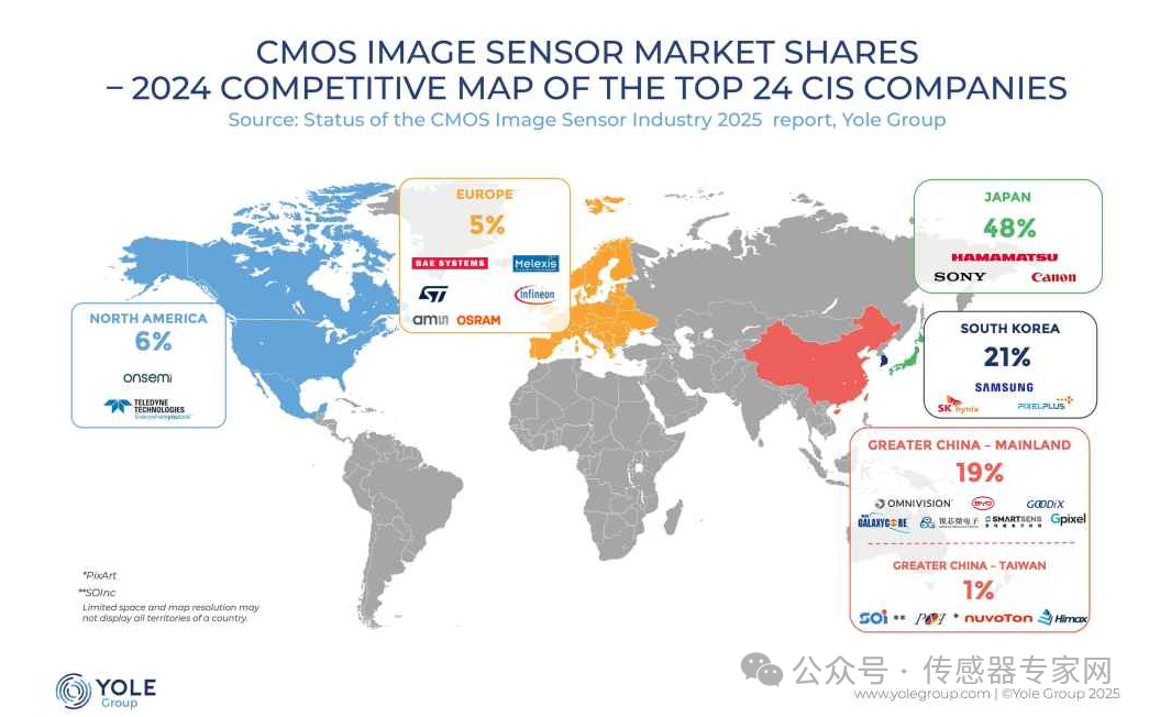 根據Yole 《Status of the CMOS Image Sensor Industry 2025》(《2025 年 CMOS 圖像傳感器行業現狀》)報告顯示,以豪威集團(原韋爾股份、Omnivision)、格科微(Galaxycore)、思特威(Smartsens)、比亞迪(BYD)、長光辰芯(Gpixel)、匯頂科技(Goodix)、銳芯微為代表的中國大陸CMOS圖像傳感器產生,占據全球19%的市場份額。此外,中國臺灣省的原相科技、晶相科技、敦泰科技等廠商,合計占1%市場份額。