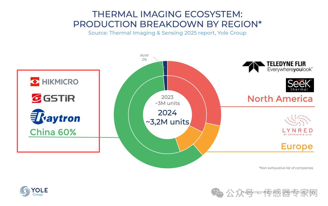 根據Yole 8月份剛剛發布的最新《Thermal Imaging and Sensing 2025》(《熱成像與傳感2025》)報告顯示,以海康微影(Hikmicro)、高德紅外(Gstir)、睿創微納(Raytron)為代表的中國紅外傳感公司,占據全球60%的市場份額。