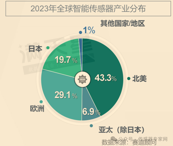 然而,在高精尖的智能傳感器市場,2023年全球智能傳感器產業由北美、歐洲、日本主導,其中,北美占比最高,達43.3%,歐洲占比29.1%,日本占比19.7%,亞太地區(除日本)占比6.9%,其他國家/地區占比1%。