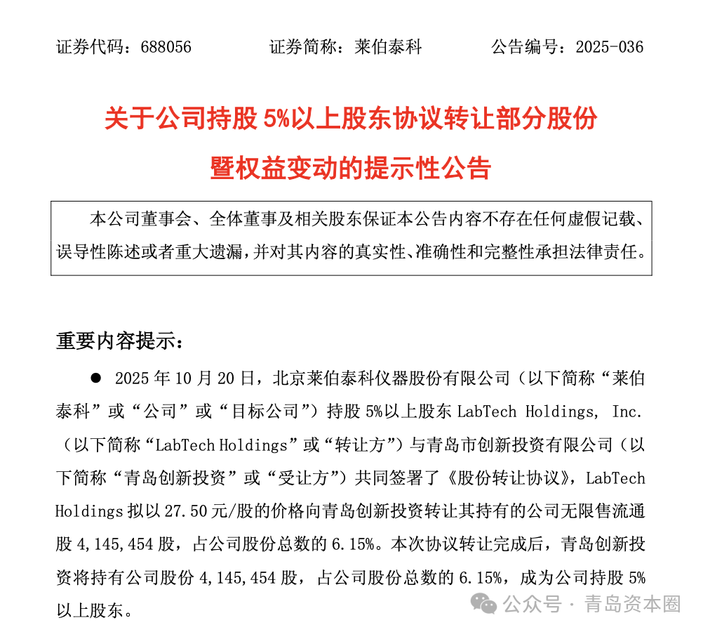10月21日,北京萊伯泰科儀器股份有限公司(股票代碼:688056,簡稱 “萊伯泰科”)發(fā)布公告稱,公司股東LabTech Holdings, Inc.(以下簡稱 “LabTech Holdings” )與青島市創(chuàng)新投資有限公司共同簽署了《股份轉(zhuǎn)讓協(xié)議》,LabTech Holdings擬以27.50元/股的價格向青島創(chuàng)新投資轉(zhuǎn)讓其持有的公司無限售流通股414.55萬股,占公司股份總數(shù)的 6.15%。本次協(xié)議轉(zhuǎn)讓完成后,青島創(chuàng)新投資將持有公司股份414.55萬股,占公司股份總數(shù)的6.15%,成為公司持股5%以上股東。