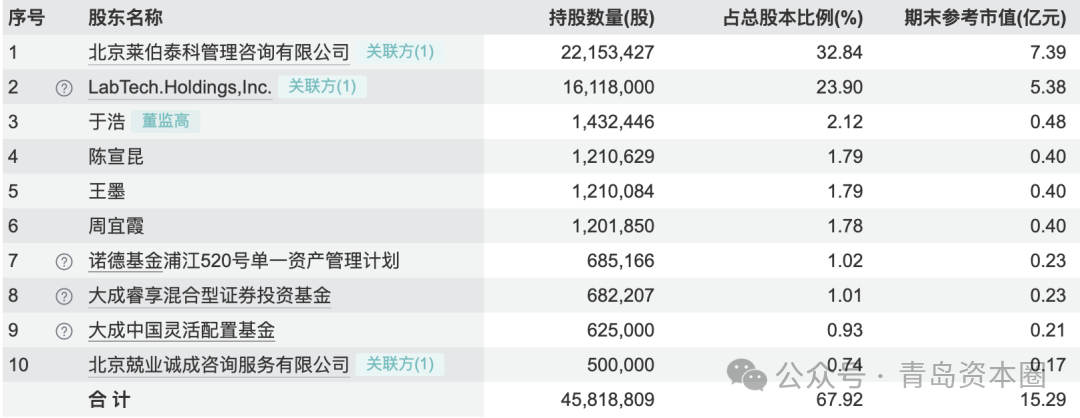 截至 2025 年半年度報告期末,萊伯泰科股東總數(shù)為3635戶。從主要股東來看,北京萊伯泰科管理咨詢有限公司為公司控股股東,持股數(shù)量 2215.34 萬股,持股比例 32.84%;LabTech Holdings, Inc. 為第二大股東,持股 1611.80 萬股,持股比例 23.90%;此外,于浩、陳宣昆、王墨等自然人股東及諾德基金、大成基金等機構(gòu)股東也持有一定比例股份。青島市創(chuàng)新投資有限公司本次戰(zhàn)略入股后,將成為公司第三大股東。
