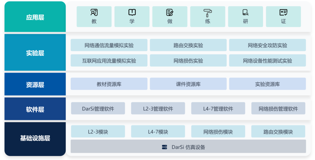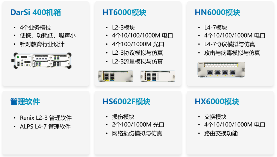 5. 基礎(chǔ)設(shè)施層 (Infrastructure Layer):以DarSi 設(shè)備為基礎(chǔ),集成了模塊化的硬件功能,包括 L2-3模塊、L4-7模塊、網(wǎng)絡(luò)損傷模塊和路由交換模塊。這為模擬真實(shí)網(wǎng)絡(luò)環(huán)境的“規(guī)模”和“復(fù)雜度”提供了強(qiáng)大的硬件保障。