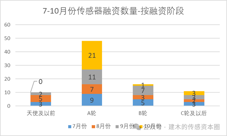 20257-10月份傳感器行業的融資數量和輪次統計如下。20257-10月共有85起融資案例,分別為20、17、2225起融資,融資數量相對比較穩定,平均每月20起左右。
