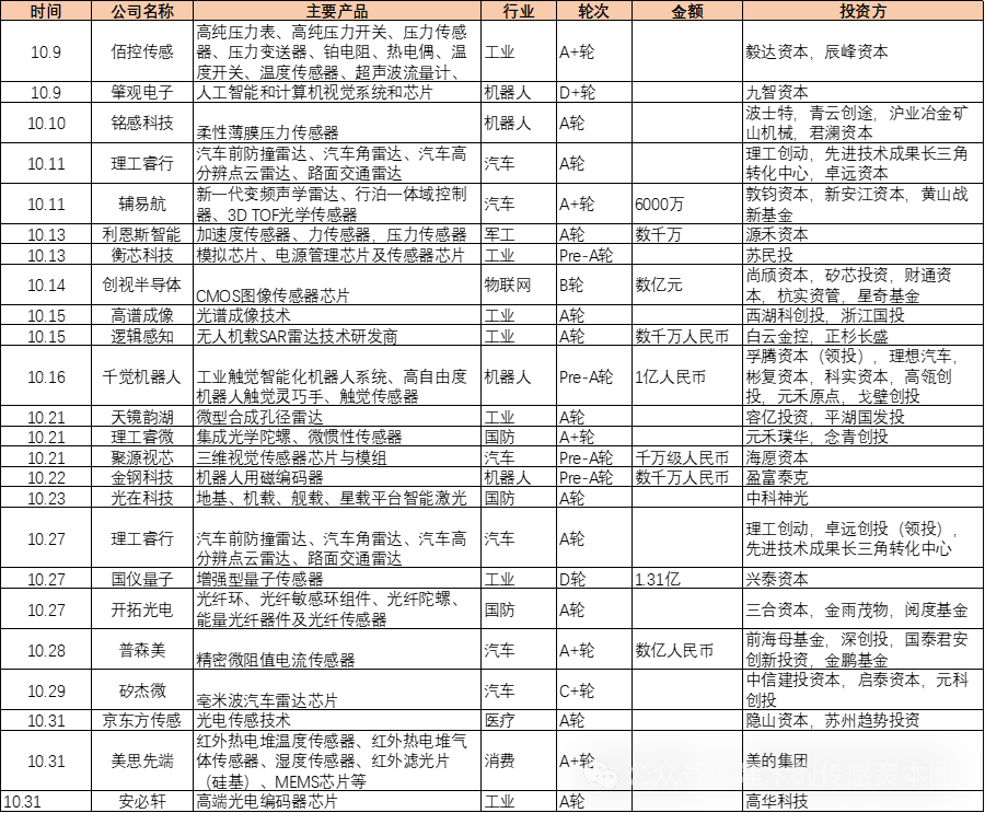 從融資數量上看,工業、汽車、機器人數量居于前三位,分別是8家、6家、5家,合計占比80%。本月機器人數量略有下滑,汽車領域的傳感器融資數量明顯恢復。