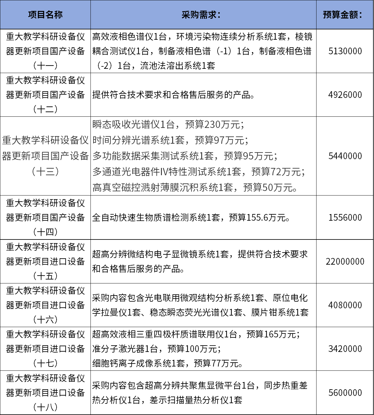 近日,河北大學(xué)發(fā)布一批重大教學(xué)科研設(shè)備儀器更新項目國產(chǎn)設(shè)備、進口設(shè)備采購公告。預(yù)算金額5215.2萬元,采購高效液相色譜儀、瞬態(tài)吸收光譜儀、全自動快速生物質(zhì)譜檢測系統(tǒng)、超高分辨微結(jié)構(gòu)電子顯微鏡系統(tǒng)、超高效液相三重四極桿質(zhì)譜聯(lián)用儀、高分辨共聚焦顯微平臺等設(shè)備。