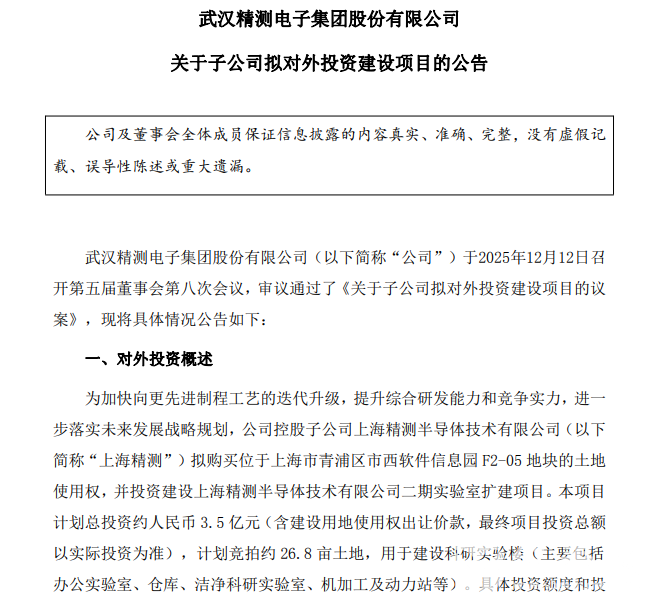 12月12日,精測(cè)電子(300567.SZ)公布,為加快向更先進(jìn)制程工藝的迭代升級(jí),提升綜合研發(fā)能力和競(jìng)爭(zhēng)實(shí)力,進(jìn)一步落實(shí)未來發(fā)展戰(zhàn)略規(guī)劃,公司控股子公司上海精測(cè)半導(dǎo)體技術(shù)有限公司(簡(jiǎn)稱“上海精測(cè)”)擬購(gòu)買位于上海市青浦區(qū)市西軟件信息園F2-05地塊的土地使用權(quán),并投資建設(shè)上海精測(cè)半導(dǎo)體技術(shù)有限公司二期實(shí)驗(yàn)室擴(kuò)建項(xiàng)目。