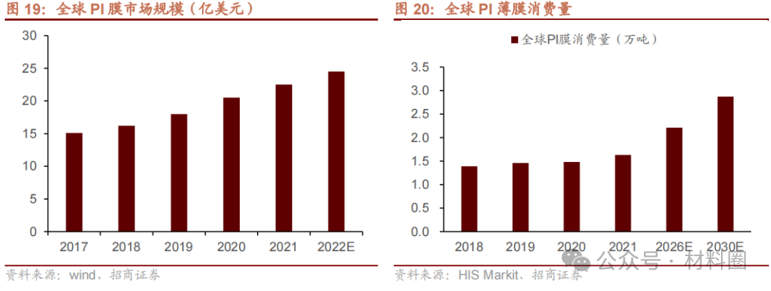 聚酰亞胺薄膜(PI 膜)是最早進(jìn)入商業(yè)流通且用量最大的PI材料。2021年,全球PI薄膜消費(fèi)量1.63萬(wàn)噸,預(yù)計(jì)到2030年將達(dá)到2.9萬(wàn)噸,年均復(fù)合增長(zhǎng)率達(dá)6.5%,全球PI薄膜市場(chǎng)規(guī)模22.5億美元。
