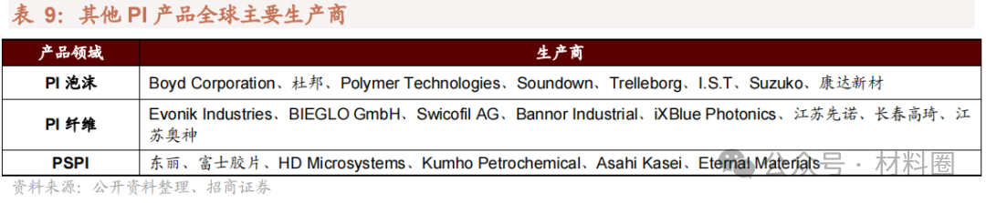 其他PI產(chǎn)品應(yīng)用大多局限于軍事領(lǐng)域,尚未形成大規(guī)模商業(yè)化應(yīng)用。聚酰亞胺纖維目前售價(jià)較高,目前主要以其獨(dú)特的低溫適用性(勝任外太空-100℃以下溫度環(huán)境)用于航空航天領(lǐng)域。目前實(shí)現(xiàn)大規(guī)模生產(chǎn)的廠商只有目前德國(guó)Evonik(P84纖維)和我國(guó)長(zhǎng)春高琦(軼綸纖維)。PI泡沫目前最為重要的應(yīng)用為艦艇用隔熱降噪材料,美國(guó)海軍已把 PI 泡沫用作所有水面艦艇和潛艇的隔熱隔聲材料,INSPEC 公司生產(chǎn)的SOLIMIDE 泡沫已被超過 15 個(gè)國(guó)家制定用于海軍船舶的隔熱隔聲體系,但其暫未大規(guī)模進(jìn)入民用領(lǐng)域。
