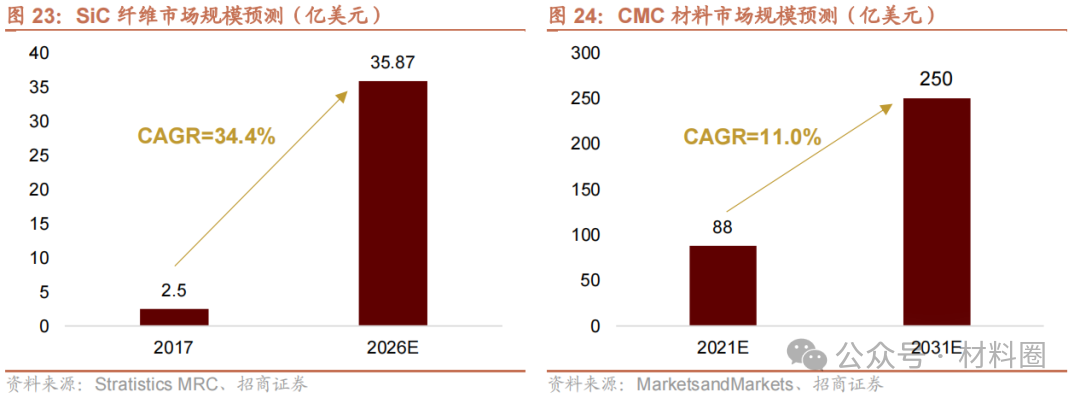 預(yù)計(jì)未來(lái)各國(guó)對(duì)航空航天領(lǐng)域的投入加大,推動(dòng)SiC纖維規(guī)模高速增長(zhǎng)。根據(jù)Stratistics MRC預(yù)測(cè),2026年SiC纖維的市場(chǎng)規(guī)模將增長(zhǎng)至35.87億美元,2017~2026年間復(fù)合年增長(zhǎng)率將達(dá)到34.4%。SiC纖維下游最主要的應(yīng)用之一是SiC纖維復(fù)合陶瓷基材料(CMC材料),未來(lái)十年,伴隨著綜合國(guó)力的增強(qiáng)以及國(guó)際形勢(shì)的不確定性,以中國(guó)為代表的主要發(fā)展中國(guó)家有望加大航空航天領(lǐng)域的投入力度。在此背景下,憑借輕量化、高耐熱、抗氧化的顯著優(yōu)勢(shì),CMC材料的使用率有望大幅增長(zhǎng)。根據(jù)MarketsandMarkets預(yù)測(cè),到2031年,全球CMC材料市場(chǎng)規(guī)模將達(dá)到250億美元,2021~2031年間復(fù)合年增長(zhǎng)率將達(dá)到11.0%。