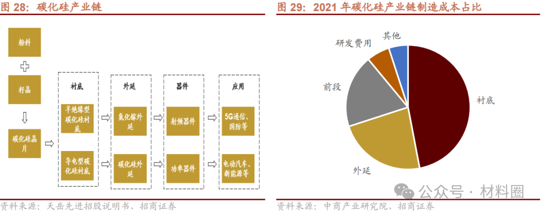 碳化硅生產(chǎn)過程分為單晶生長(zhǎng)、外延層生長(zhǎng)及器件制造三大步驟,對(duì)應(yīng)的是產(chǎn)業(yè)鏈襯底、外延、器件與模組三大環(huán)節(jié)。其中,襯底和外延占據(jù)主要價(jià)值,在產(chǎn)業(yè)鏈中的成本占比分別為47%、23%。
